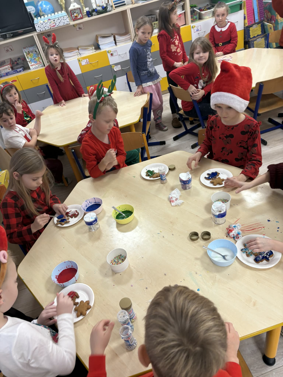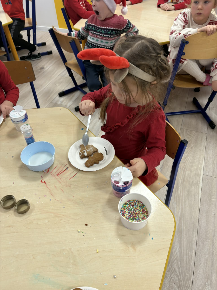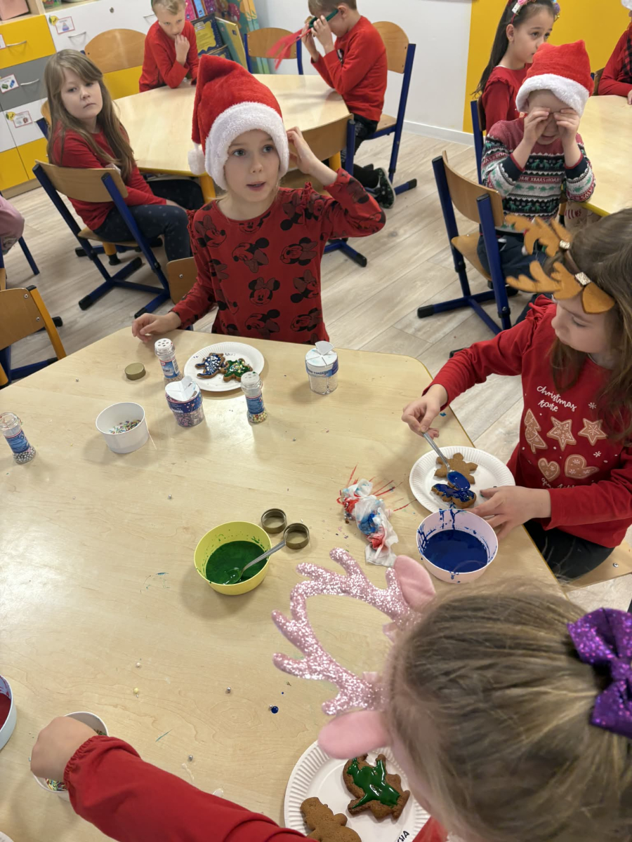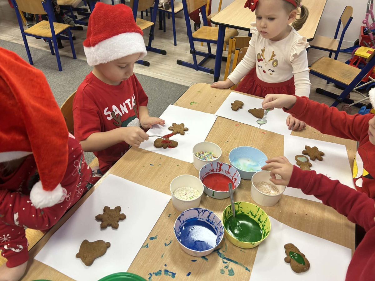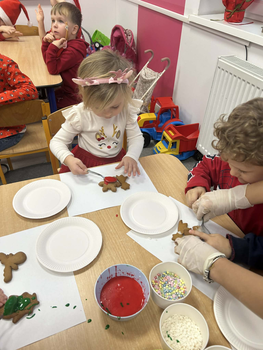 Następnie z wielką radością wałkowały ciasto, wycinały kształty gwiazdek, serduszek i choinek, a po upieczeniu – dekorowały pierniczki lukrem i barwnymi posypkami.