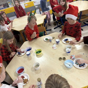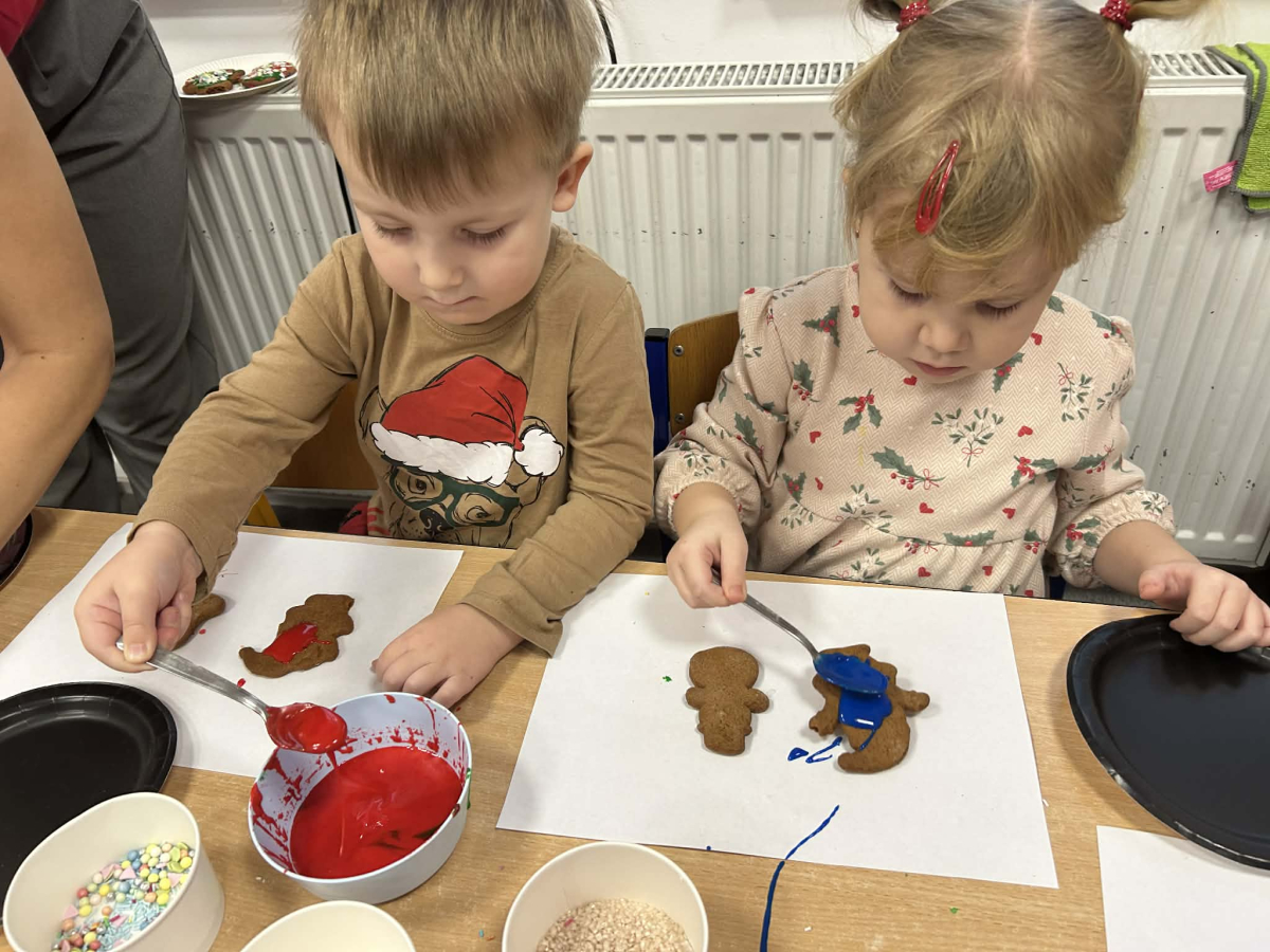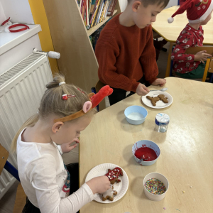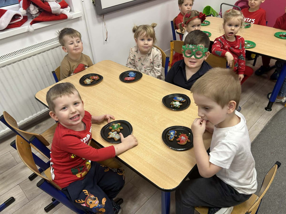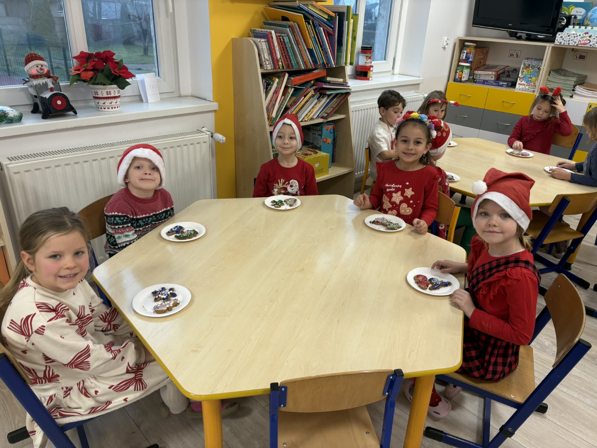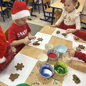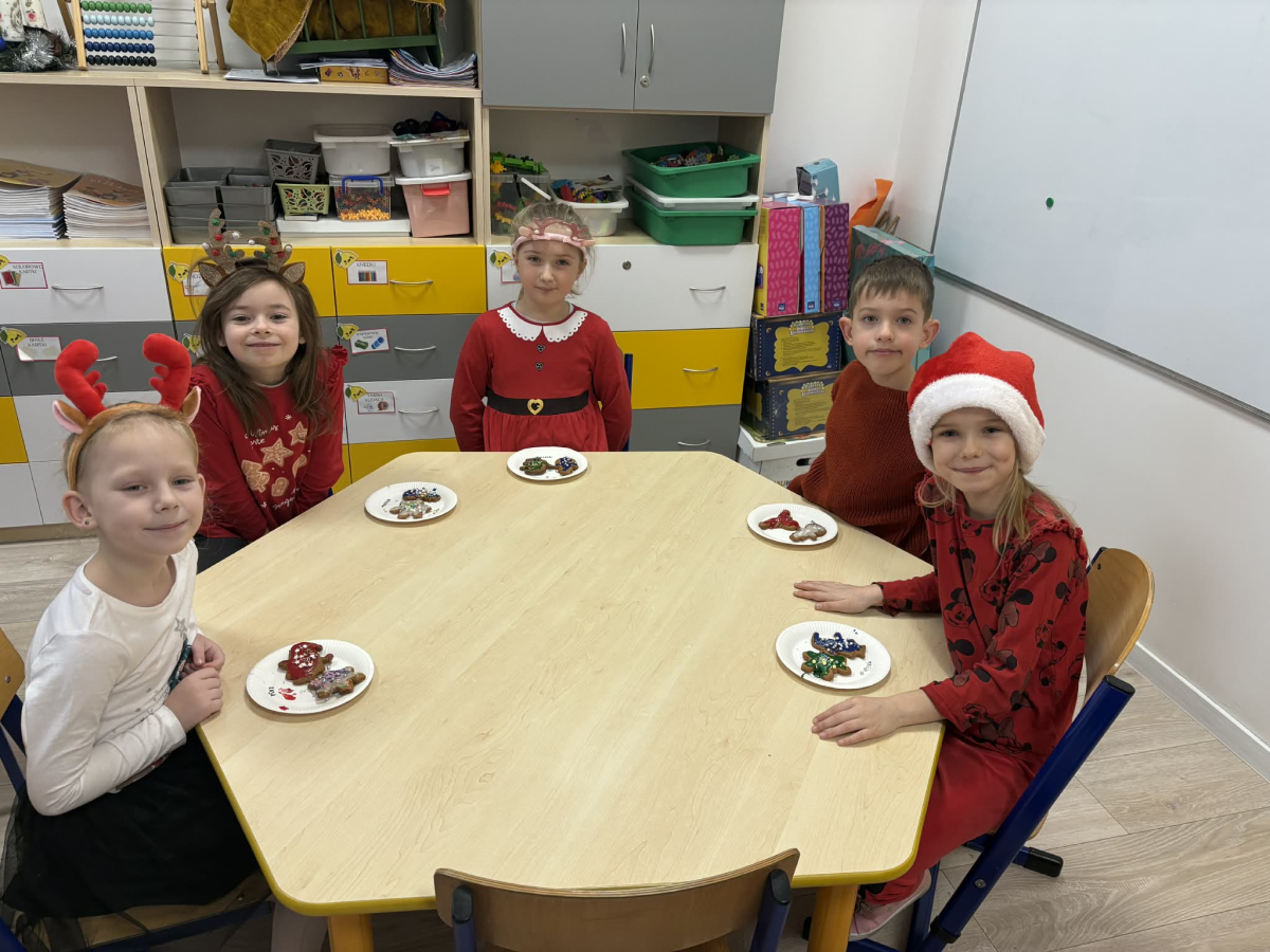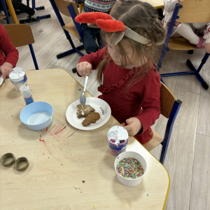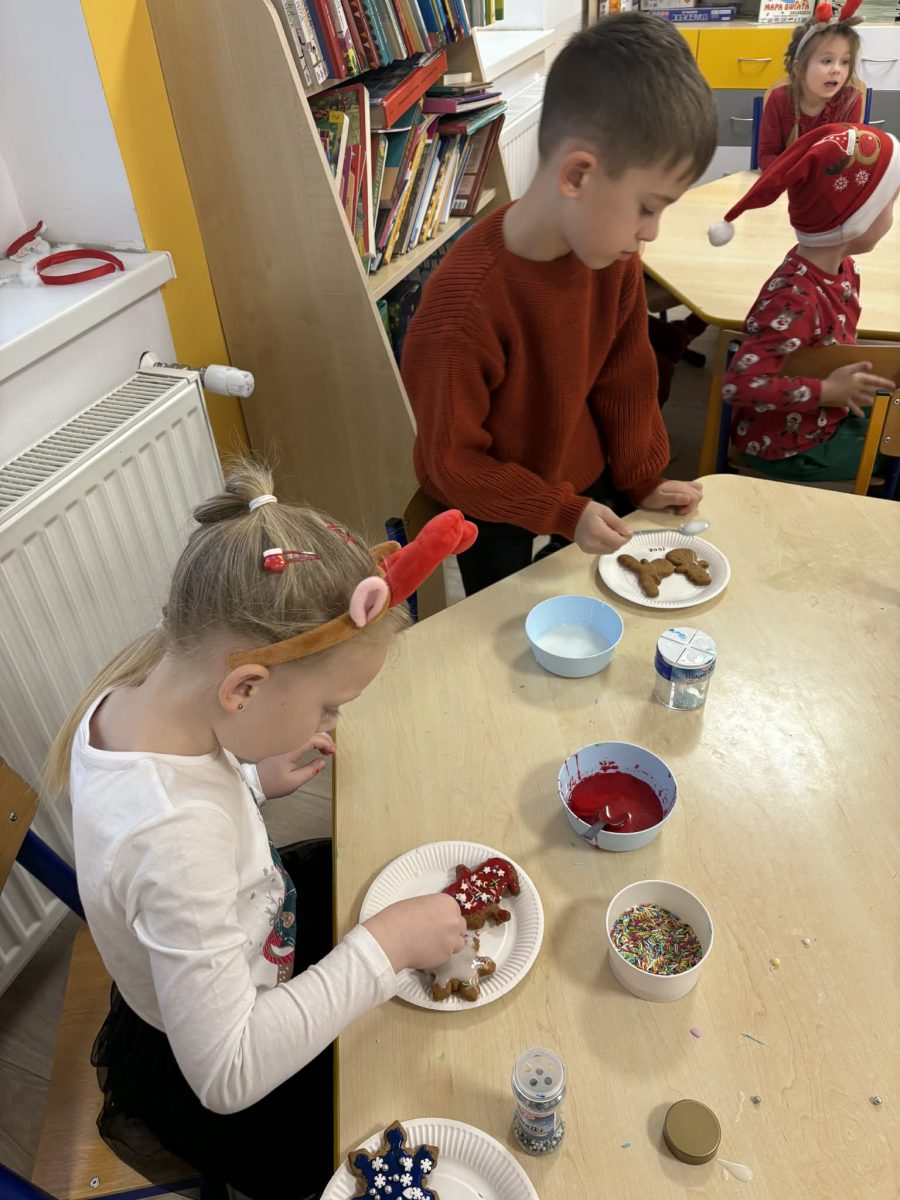Następnie z wielką radością wałkowały ciasto, wycinały kształty gwiazdek, serduszek i choinek, a po upieczeniu – dekorowały pierniczki lukrem i barwnymi posypkami.